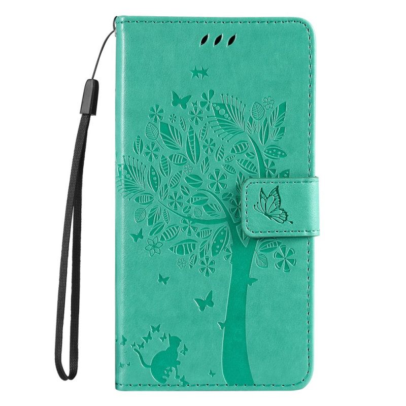 - De hoes is voorzien van een prachtig ontwerp met een kat en een boom, geprint op de voorkant en het kaartsleuvenvak, wat een vleugje luxe en uniciteit toevoegt.